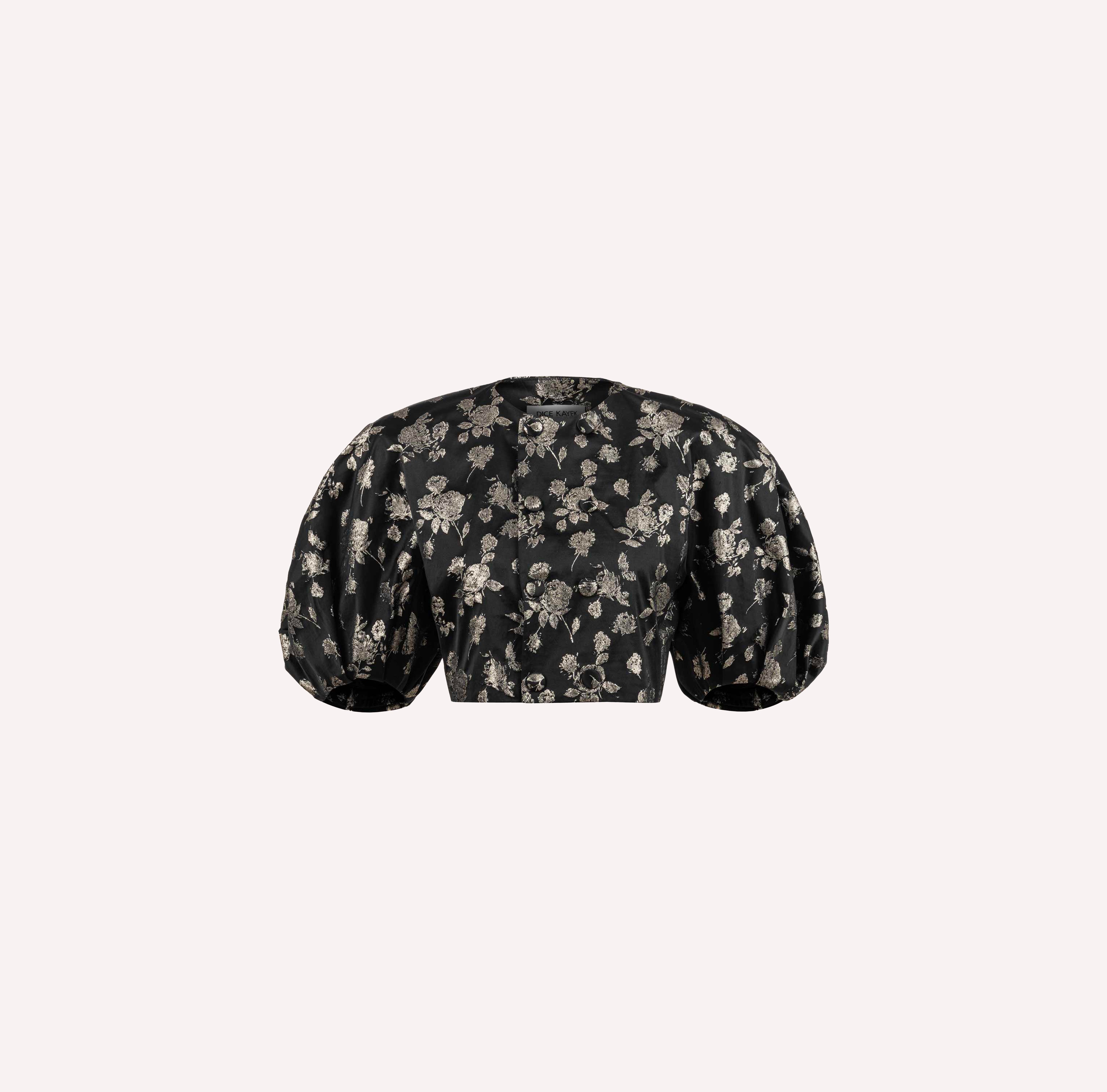 This stylish black and gold floral print jacket features balloon sleeves, perfect for adding a touch of elegance to any outfit. Made with high-quality brocade fabric, this jacket is a must-have for those looking to make a statement.
