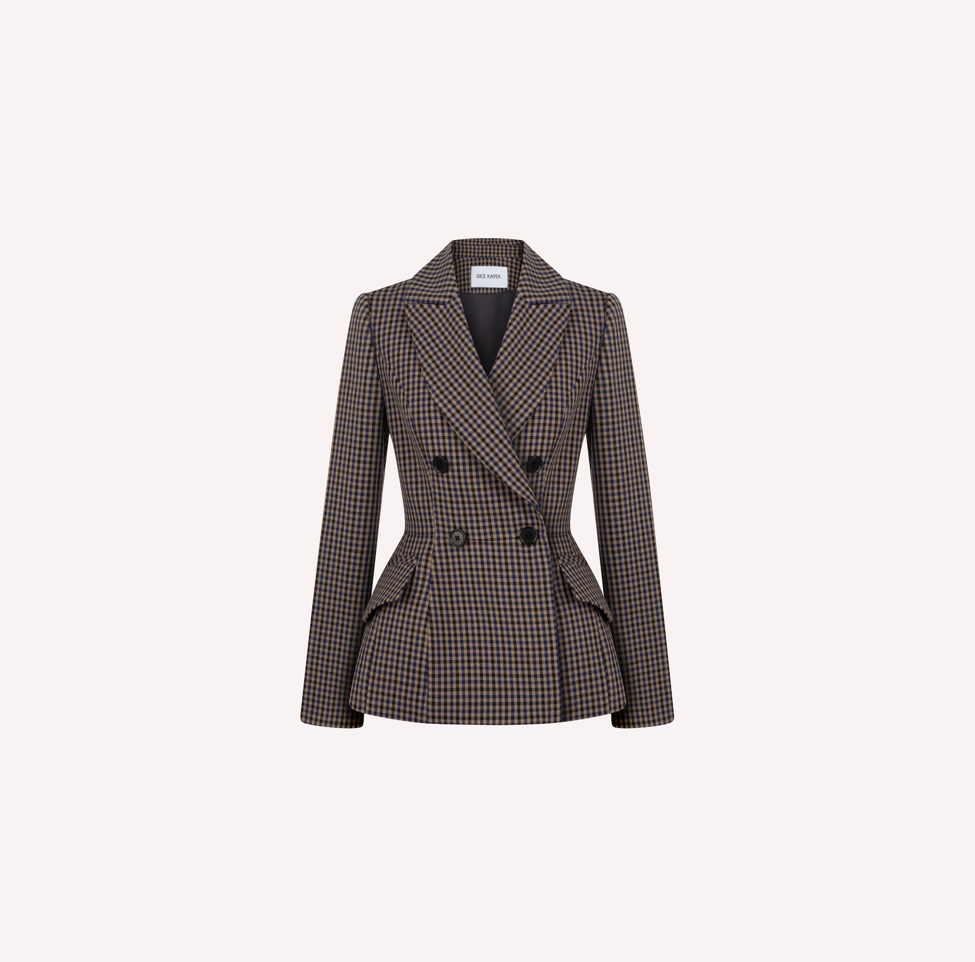 A statement of architectural precision, the Checked Sculptural Peplum Jacket reflects Dice Kayek’s mastery in structured tailoring. The double-breasted silhouette is sharply contoured through the waist, opening into a sculptural peplum that creates controlled volume and a distinctly feminine line. Crafted in a refined check pattern, the jacket balances heritage fabric with modern construction, resulting in a piece that is both timeless and distinctly contemporary.