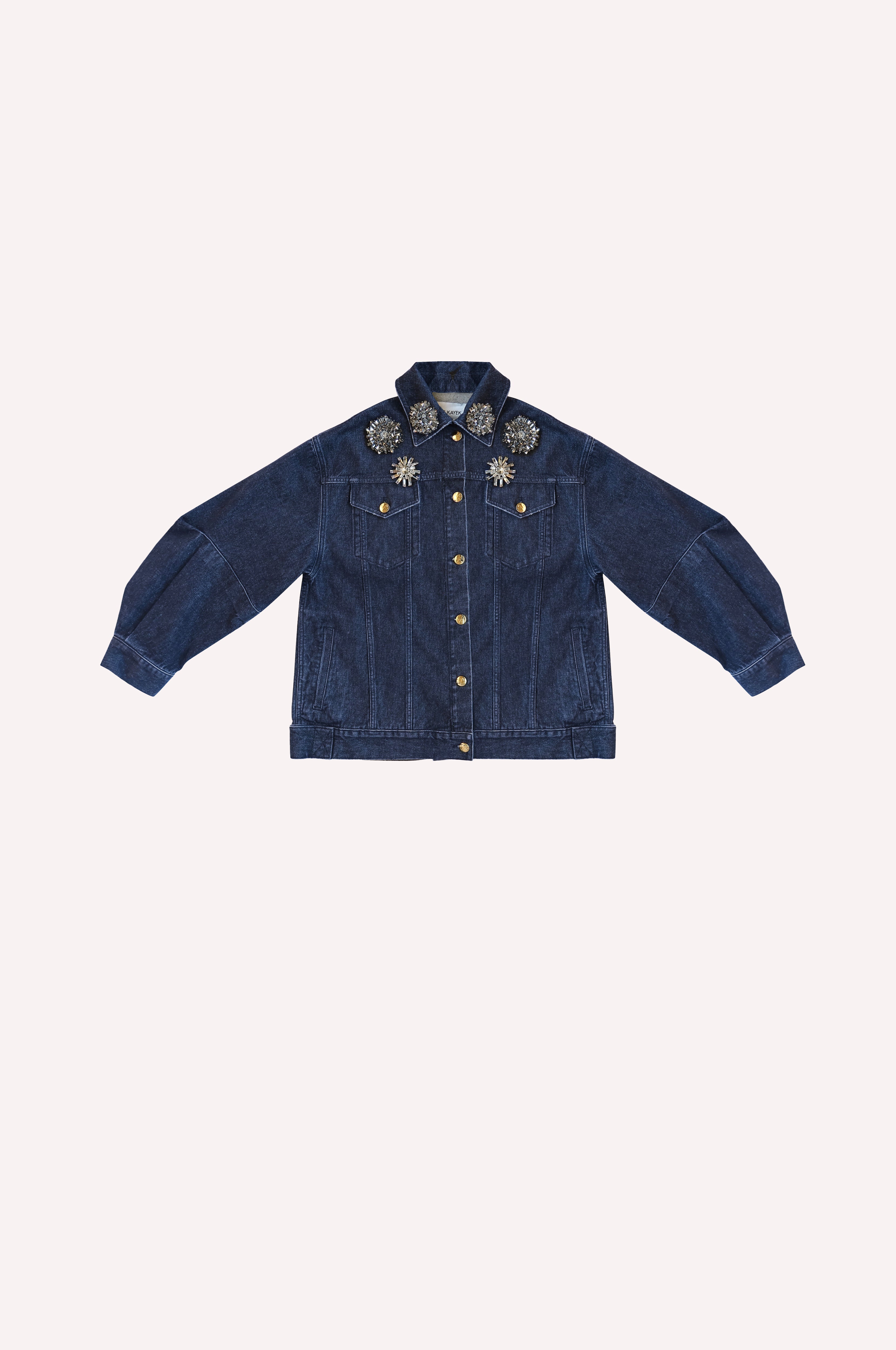 This crystal-embellished denim jacket blends structured tailoring with couture-level detailing.The relaxed silhouette is softened by the natural drape of the denim, lending a relaxed but polished look. Shiny crystal embellishments add a luxe detail — perfect for layering over both casual and tailored looks.