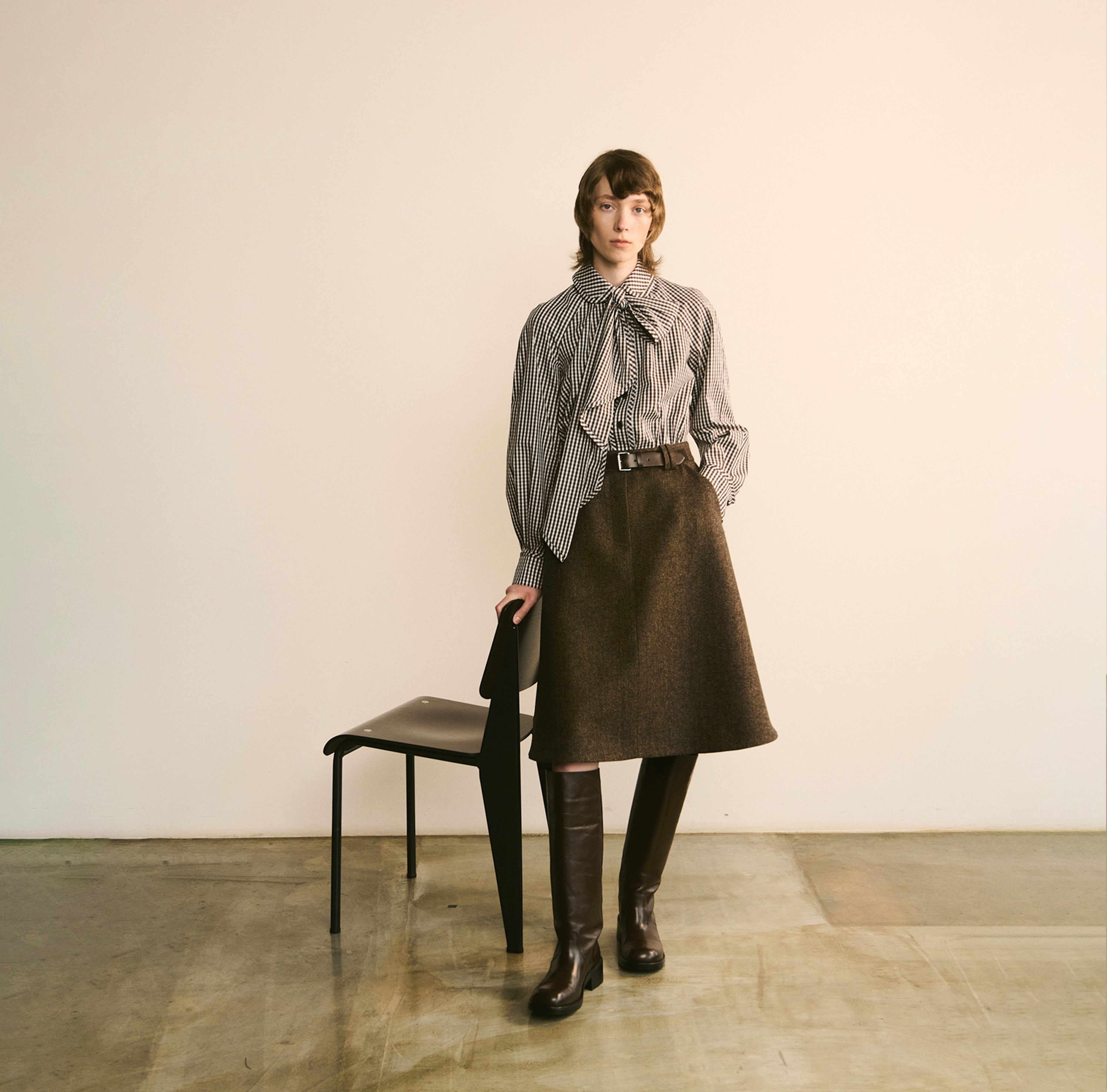 Refined yet playful, this gingham cotton shirt reinterprets a timeless pattern. Defined by its oversized bow-tie detail around the neckline and precise tailoring, it combines a sense of classic sophistication with a modern spirit. The crisp cotton fabric enhances the structured silhouette, while subtle volume at the sleeves adds an element of effortless elegance. Perfect for day-to-evening transitions.