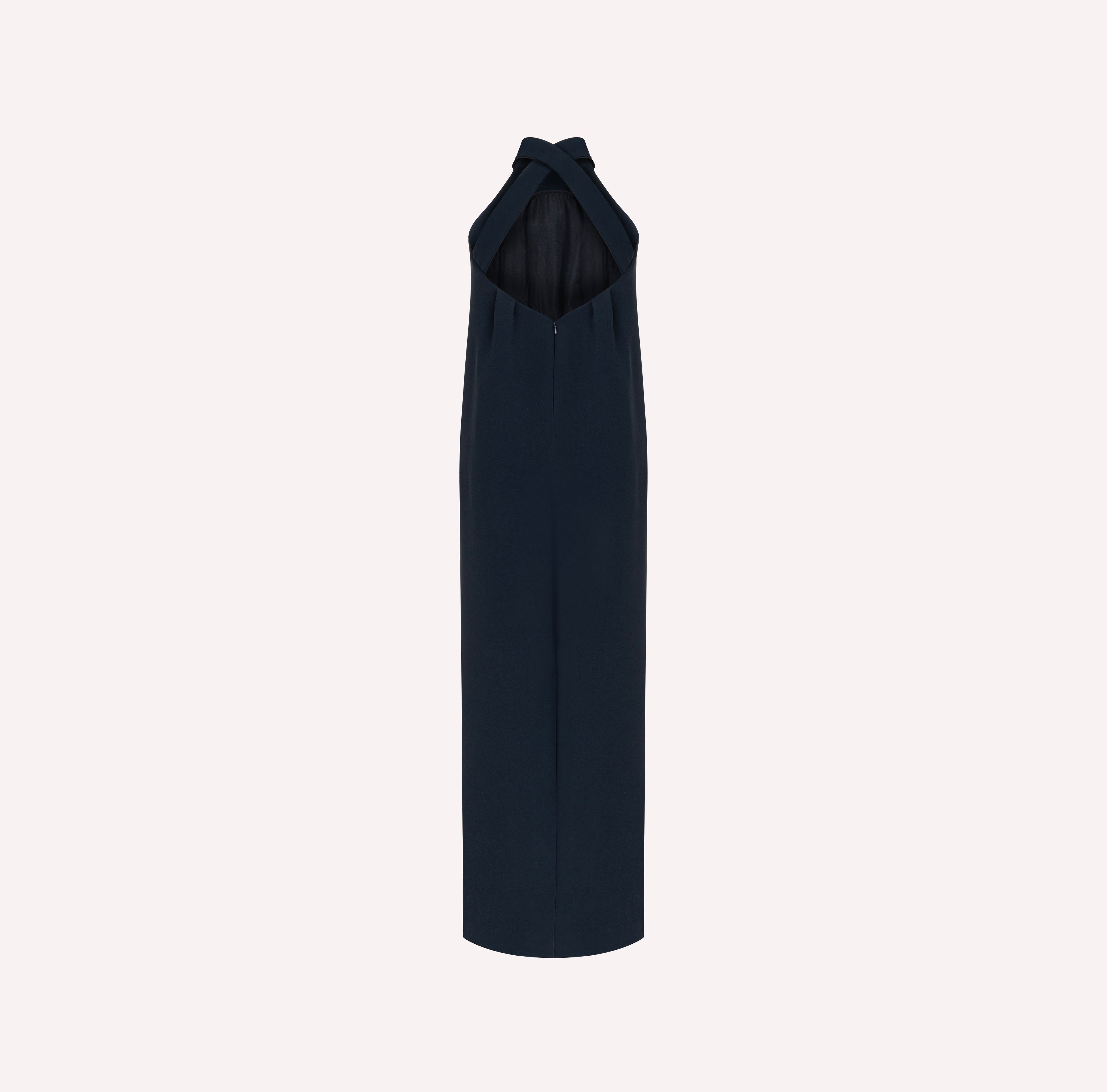 This halter maxi dress channels minimalism with sculptural precision. The clean silhouette contrasts beautifully with a criss-cross neckline that folds into an open back detail. Its deep navy hue lends timeless sophistication, making it a versatile choice for elevated daywear and eveningwear.