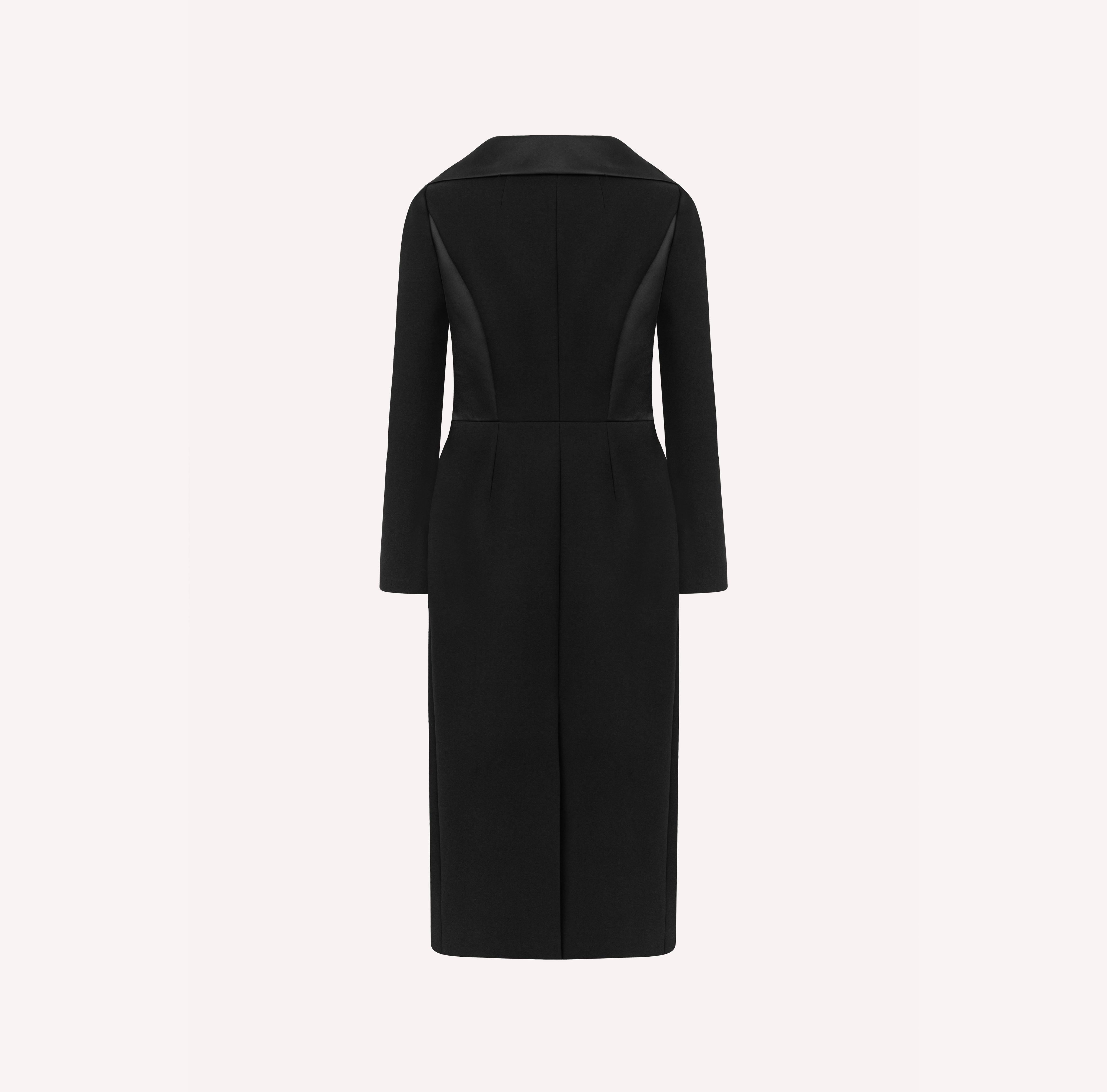 Elevate your style with this sophisticated black midi dress, seamlessly blending modern elegance and timeless sophistication. The structured silhouette and double-breasted design make it a versatile piece for any occasion, from formal events to chic day-to-night transitions. The sleek tailoring ensures a flattering fit, while the understated details add a touch of refinement.