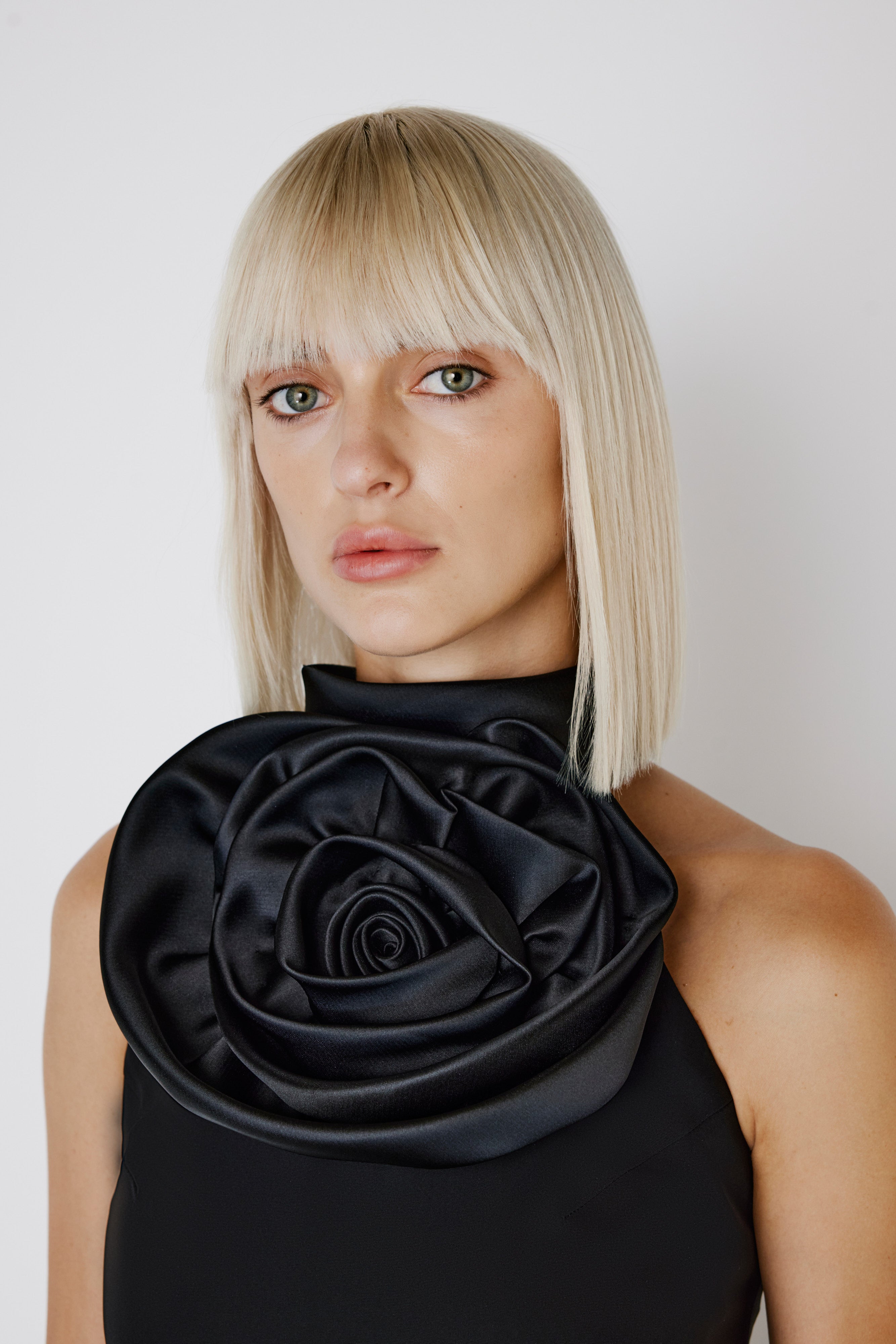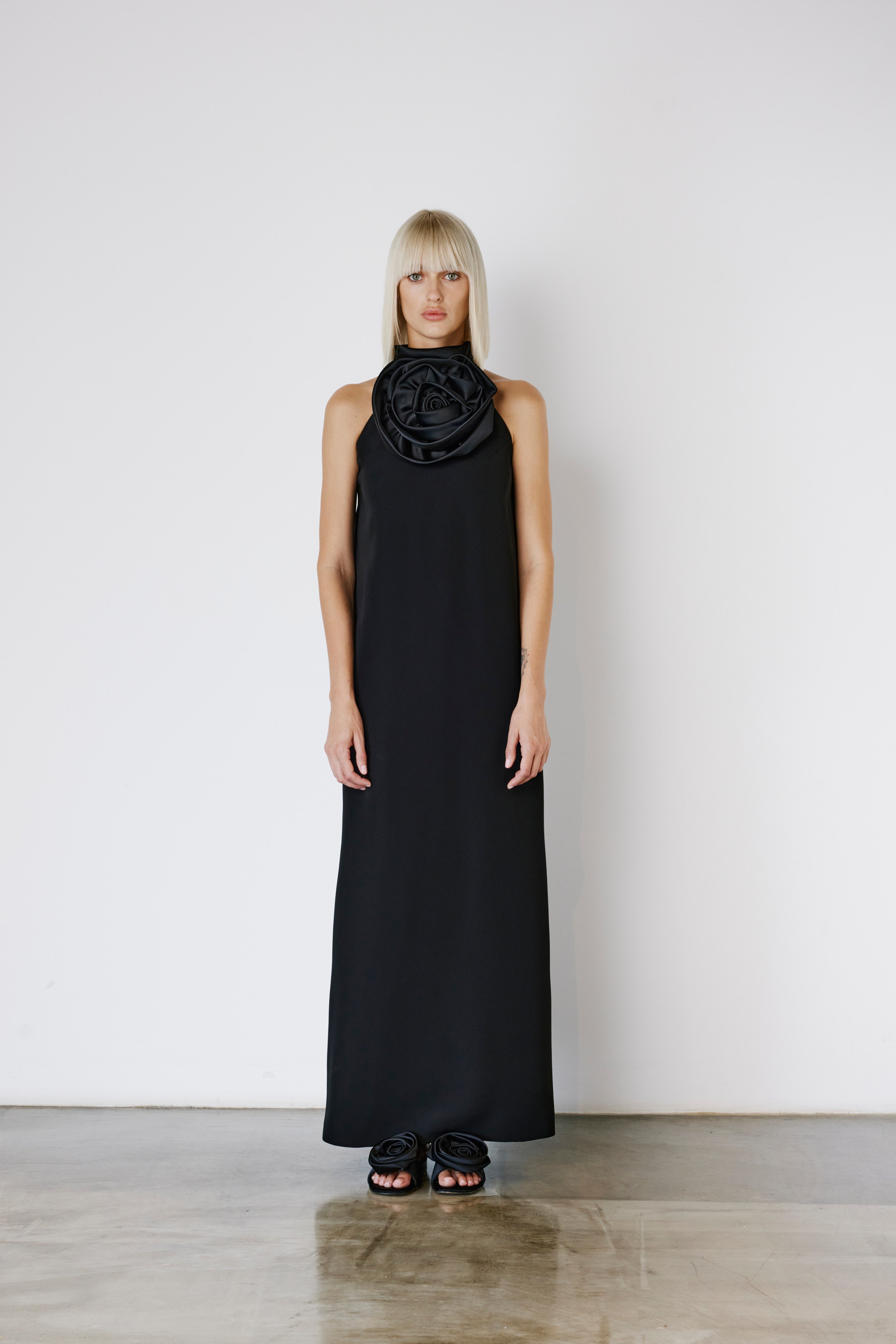 A sophisticated statement piece for evening elegance, this maxi dress features a fluid silhouette that gracefully drapes over the body. The oversized three-dimensional rose at the neckline serves as a striking focal point, while the halter design elegantly highlights the shoulders. The look is completed with a dramatic open-back detail featuring crossover straps.