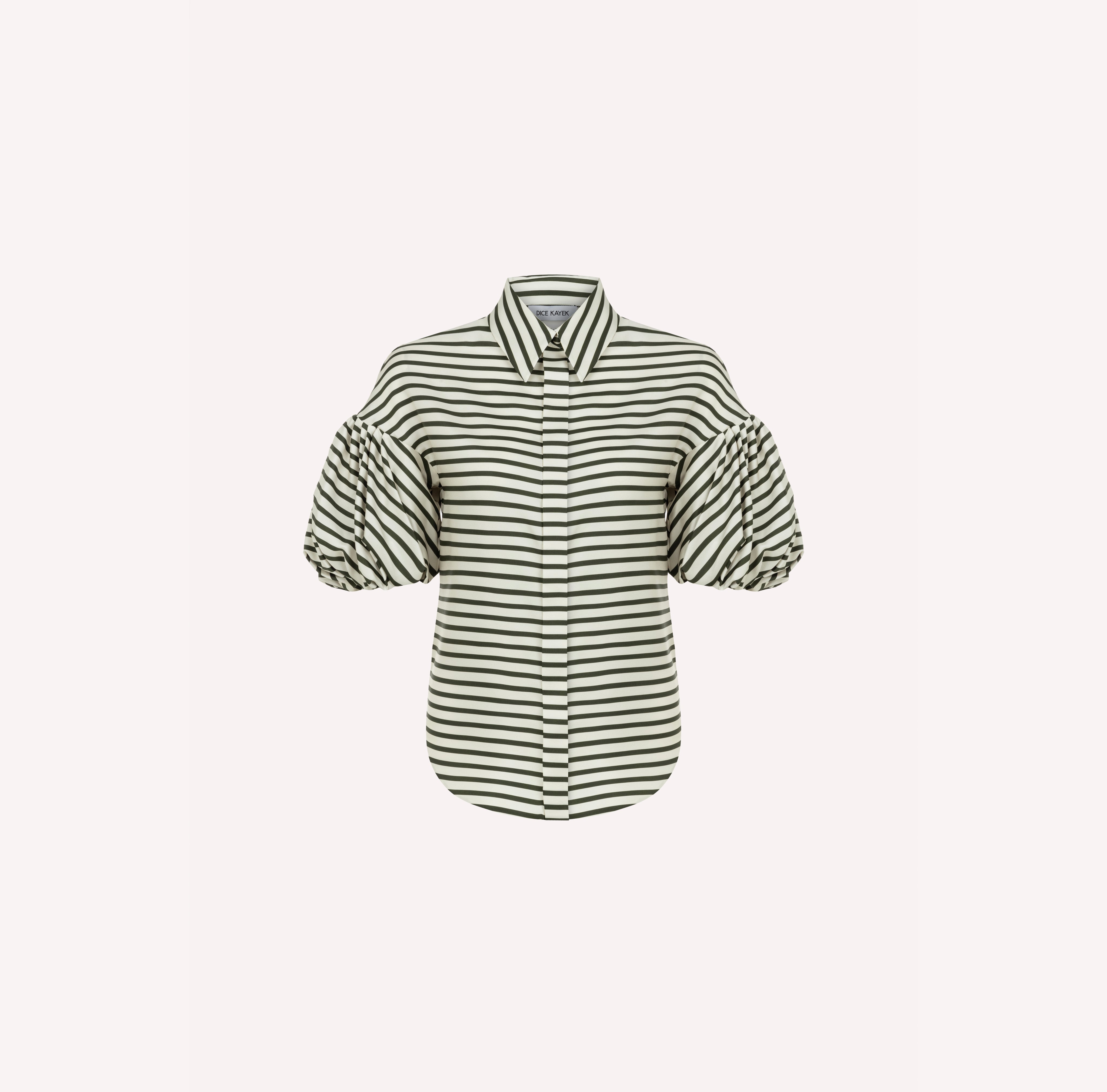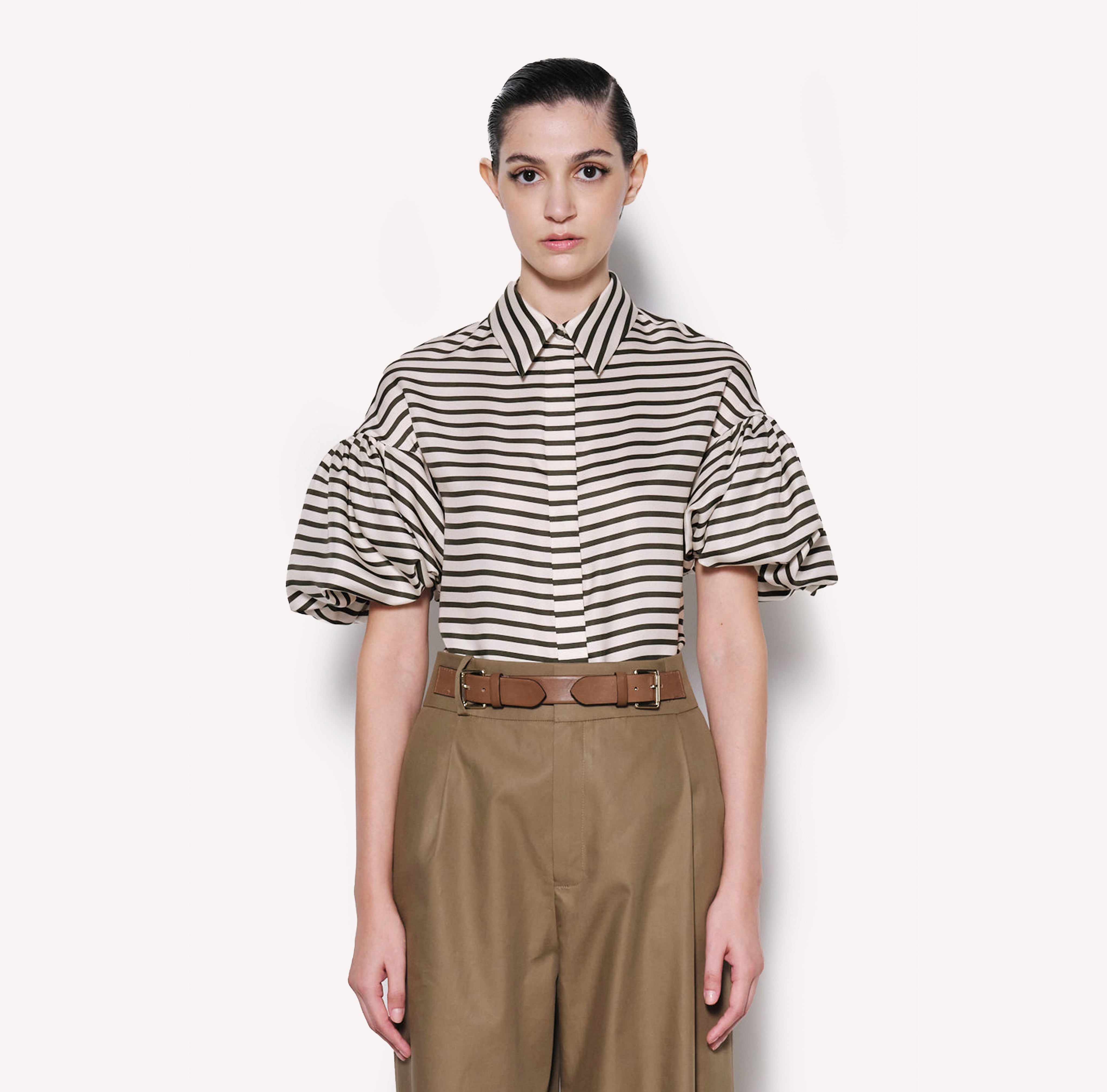 A true signature piece, this silk twill shirt is a refined expression of architectural influence and contemporary femininity. Designed with dramatic voluminous sleeves, inspired by the domes of Istanbul’s grand architecture, this piece reimagines a classic silhouette with a bold, sculptural aesthetic.