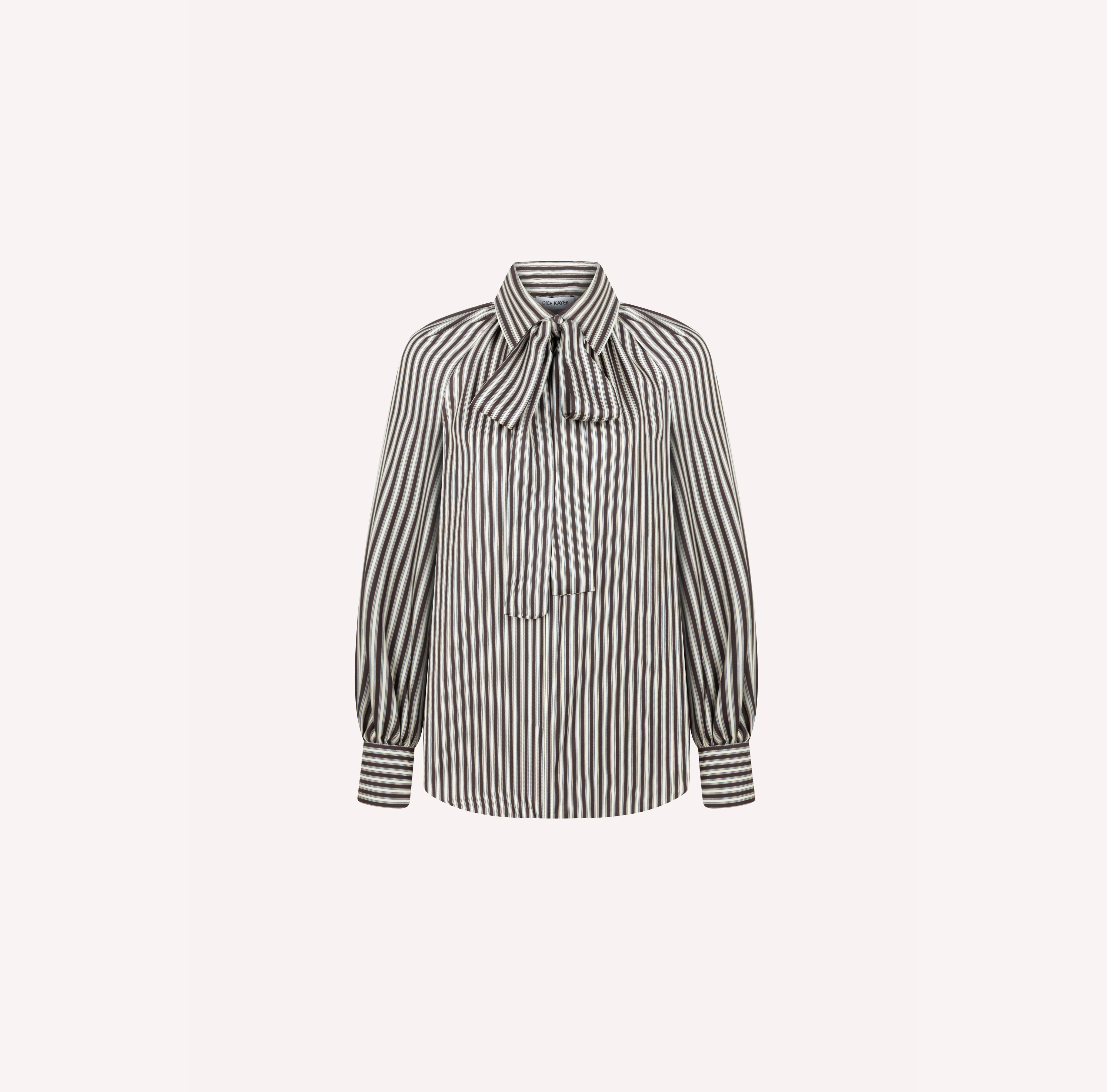 An ode to timeless femininity, this ivory silk blouse is adorned with classic polka dots and finished with an oversized bow at the neckline. The fluid drape and soft sheen of the silk lend effortless movement, while the contrast-striped cuffs add a modern twist to a vintage-inspired silhouette. Elegant yet playful, it transitions seamlessly from day to evening.