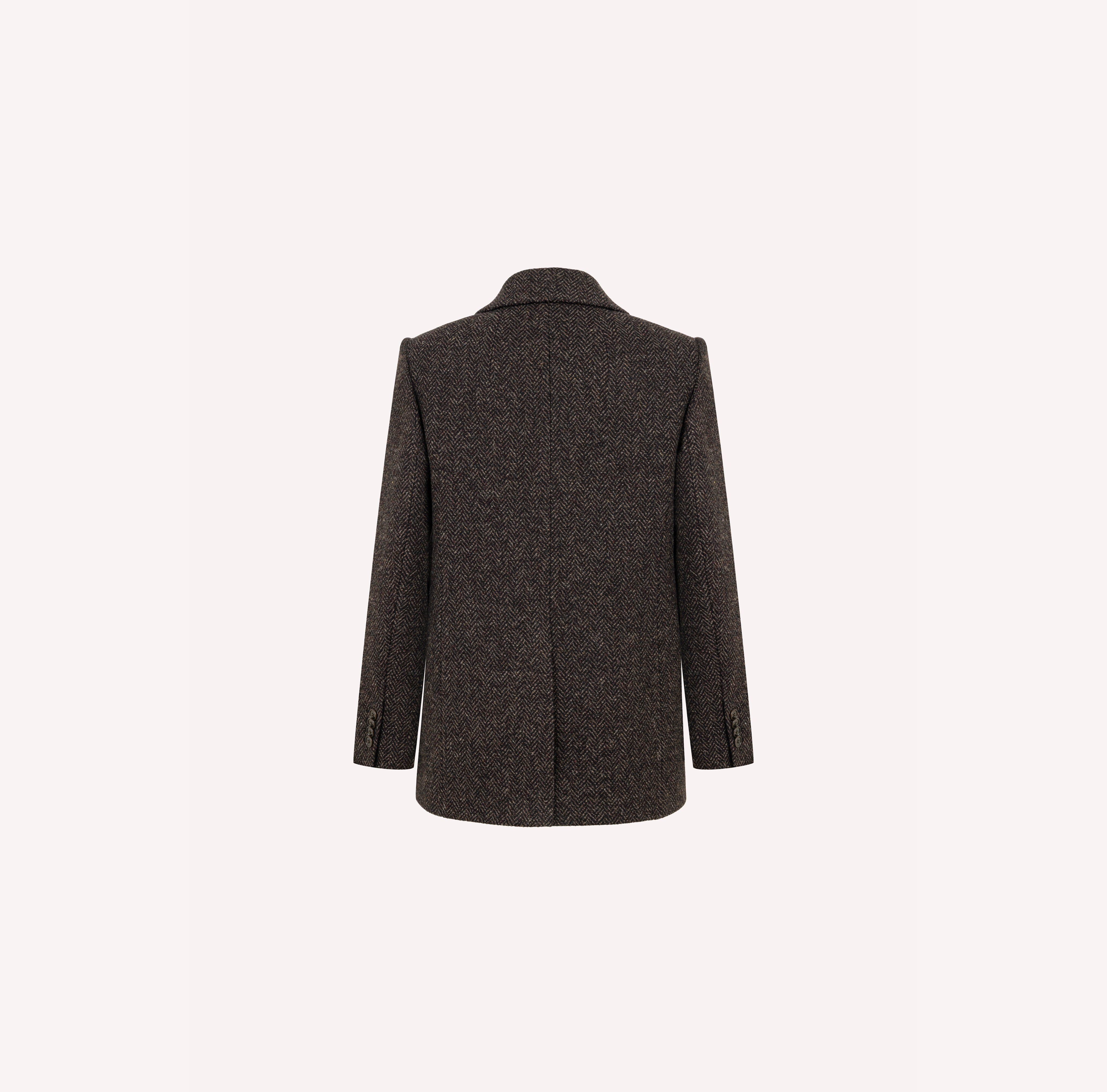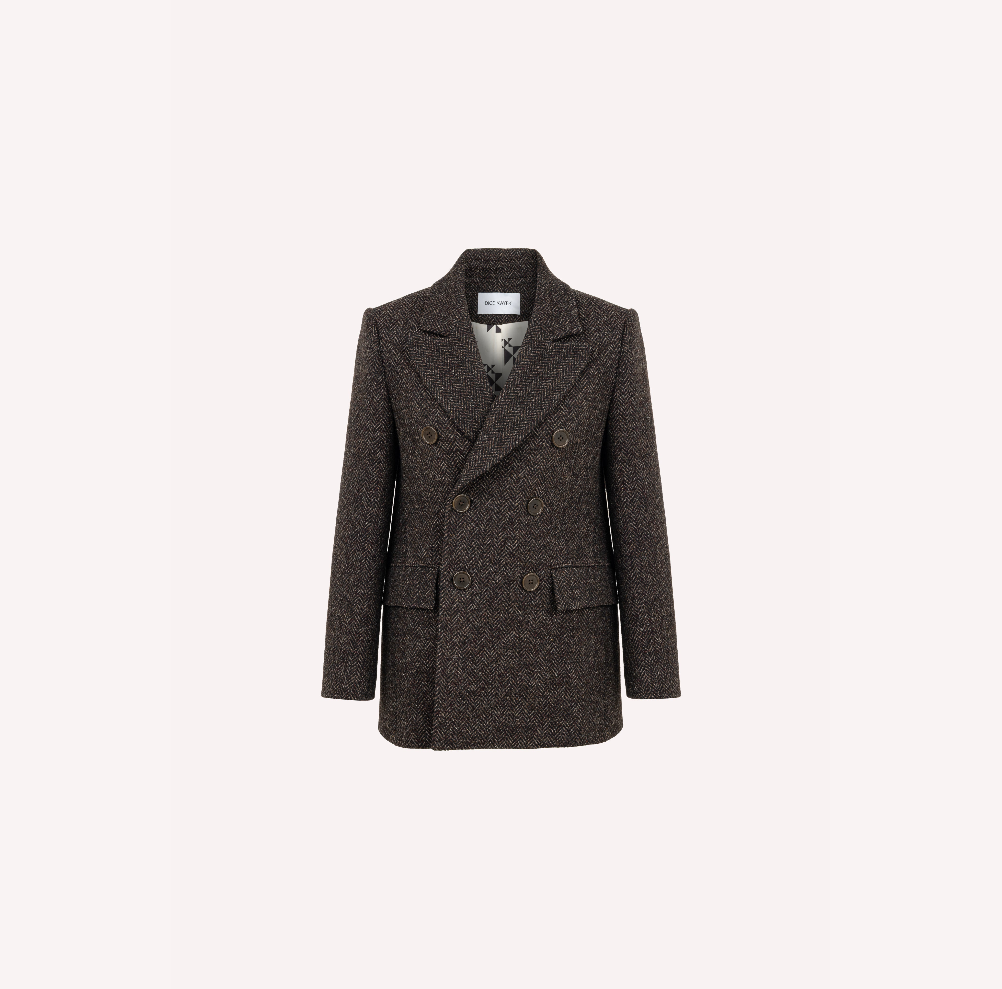 A modern wardrobe essential, this brown jacket is crafted from rich textured wool and tailored for a relaxed, boxy silhouette. The double-breasted front, structured shoulders, and elongated length strike the perfect balance between sharp tailoring and effortless ease. Fully lined for comfort, this versatile outer layer can be styled over everything from shirts, dresses to denim, bringing warmth and understated elegance to transitional dressing.