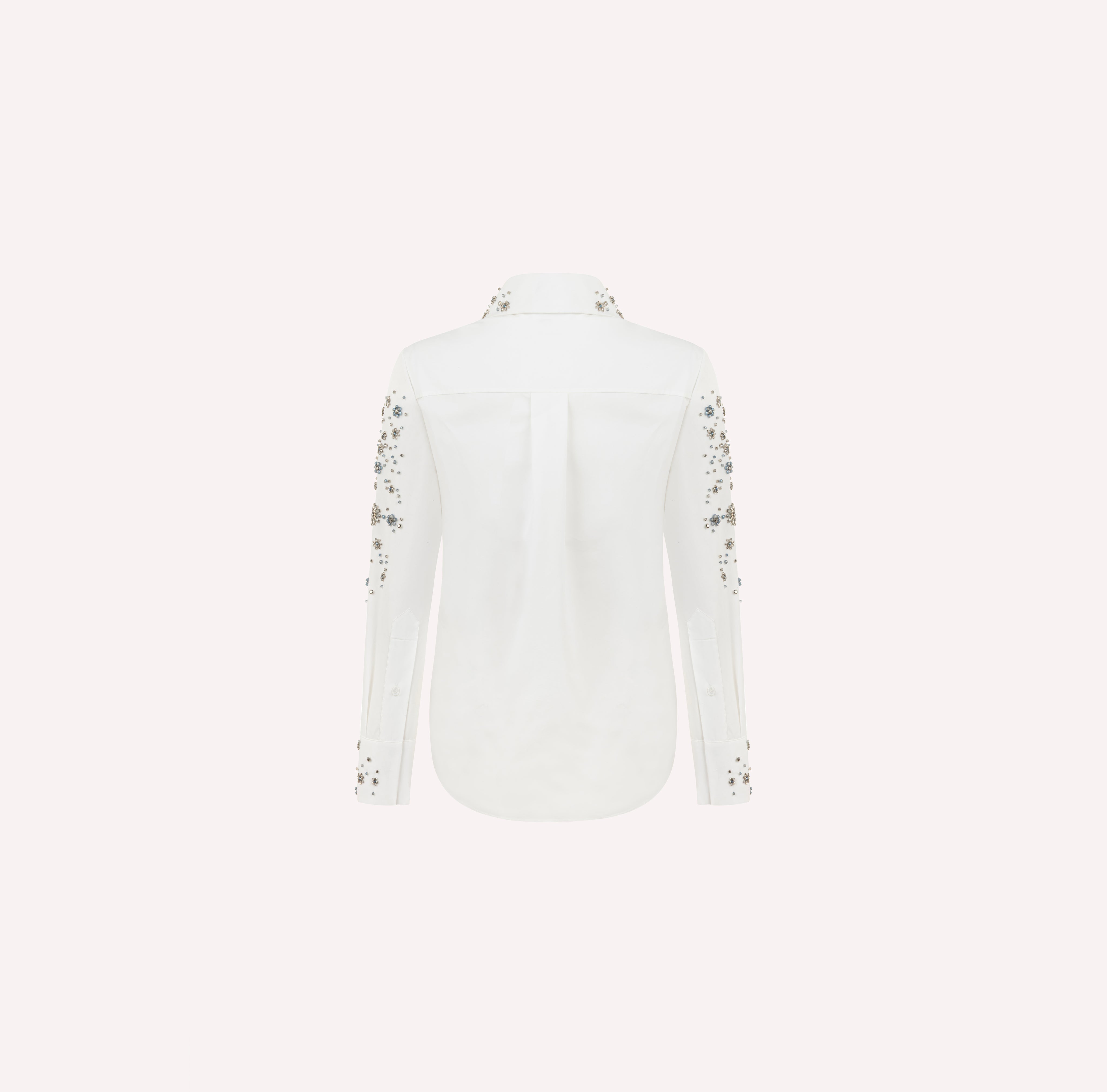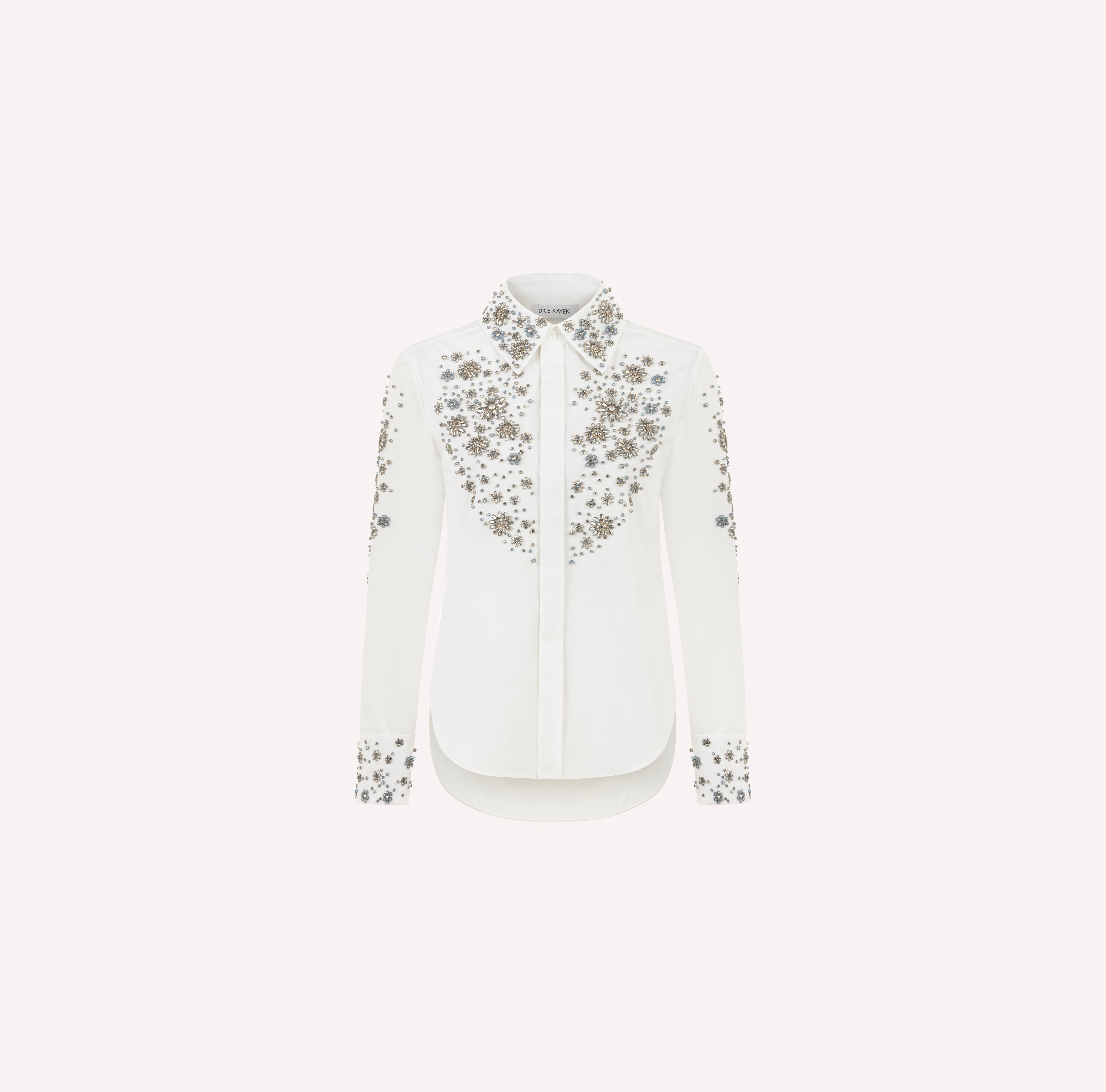 A timeless wardrobe staple reimagined with sparkling detailing, this embellished cotton shirt blends sophistication with modern design. The delicate flower shaped embellishments add a refined touch, elevating the classic design. Featuring a hidden button closure, this piece ensures a sleek finish. Perfect for day-to-night transitions, it embodies luxury with a polished edge.