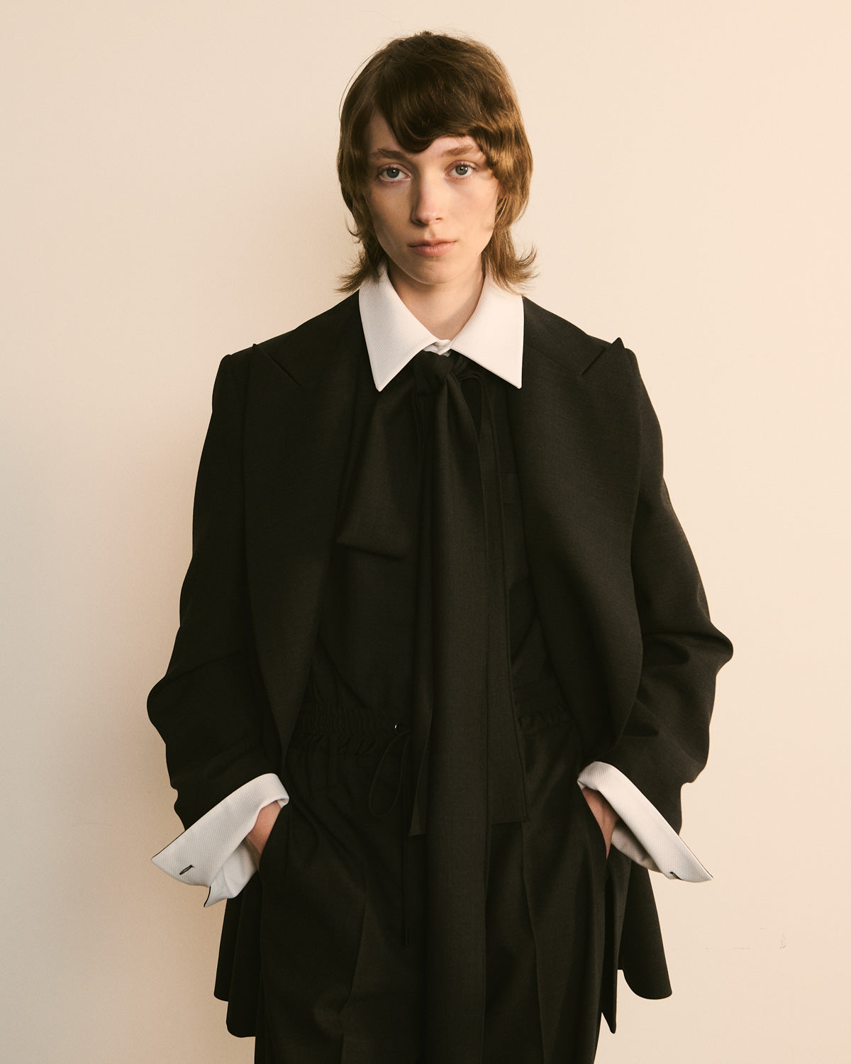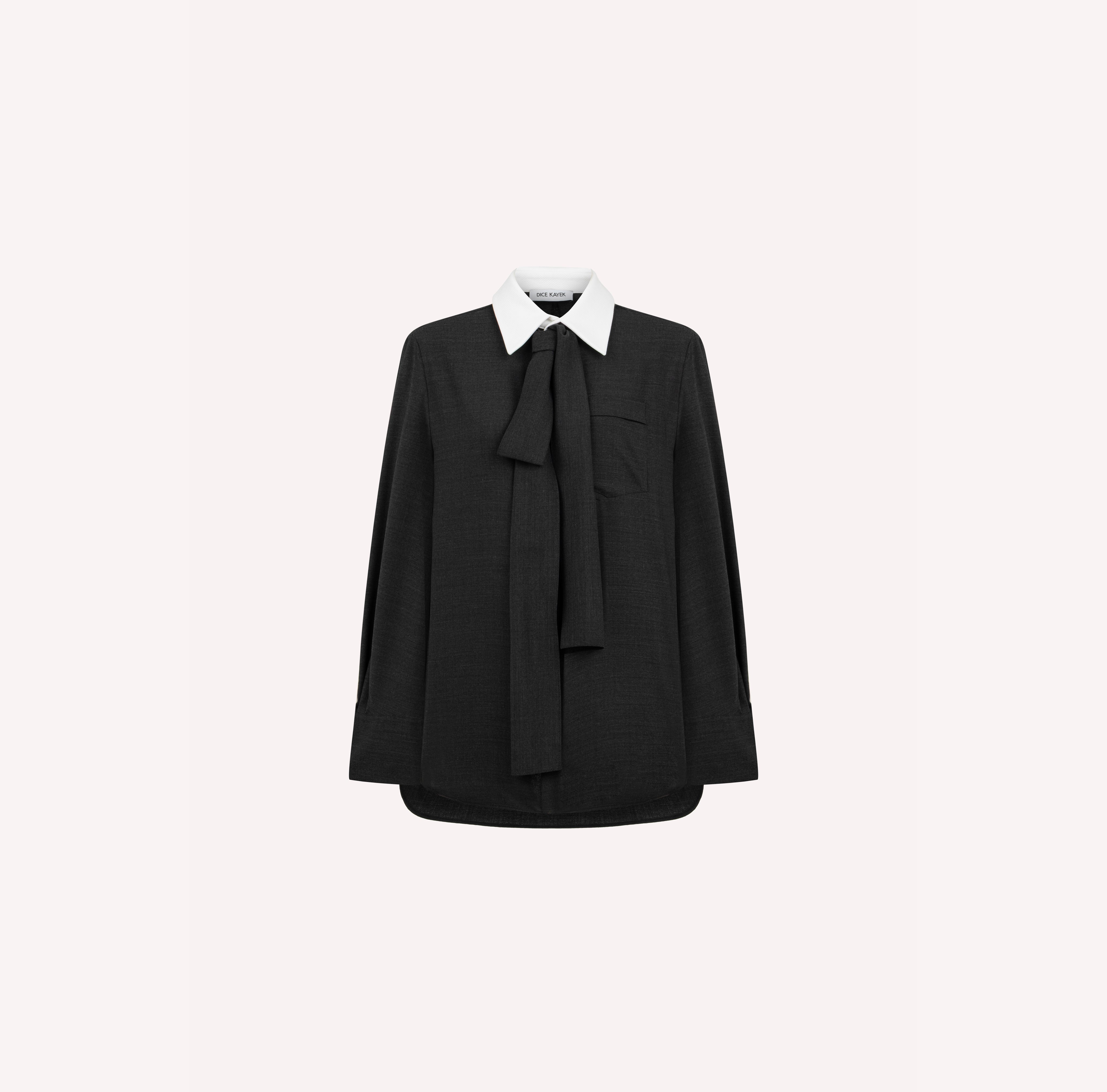 A refined take on timeless tailoring, this wool shirt combines sharp lines with feminine detailing. The crisp white contrast collar frames the neckline, while an elongated tie detail adds a touch of fluidity and elegance. Cut from lightweight wool, the shirt balances structure with softness, creating a sophisticated silhouette that transitions seamlessly from day to evening. This shirt with a concealed front pocket and clean tailoring showcases precision and modernity.